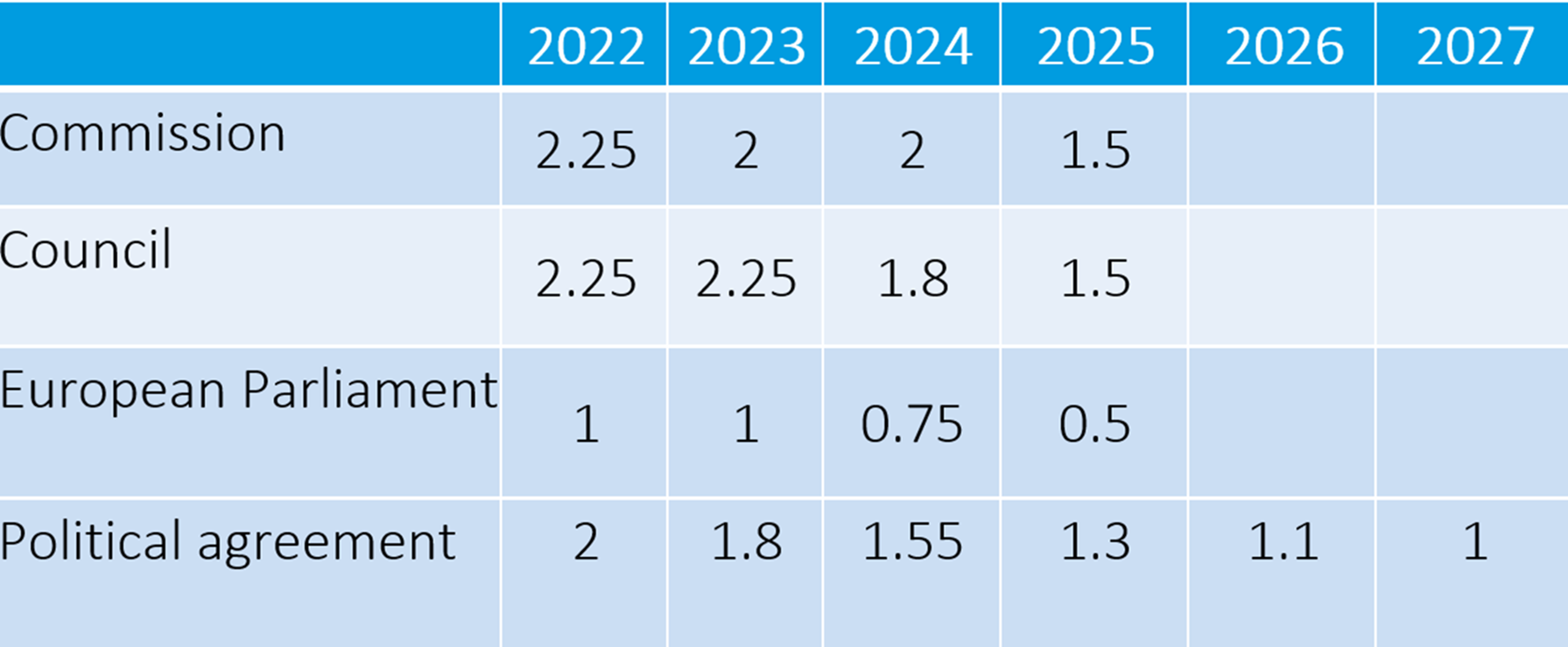 - The wholesale caps will continue to go down. However, one should note that the reduction agreed by the Trilogue is far away from market reality. The economic issue mainly regarded data services and the cost for Gigabyte, which in Europe is, at retail level, normally around 20/30 Eurocent per Gigabute. Despite of that, the wholesale caps agreed for the new regulation are much above that retail price, since they will be: 2 €/GB in 2022, 1.8 €/GB in 2023, 1.55 €/GB in 2024, 1.3 €/GB in 2025, 1.1 €/GB in 2026 and 1 EUR/GB from 2027 onwards. As a result, some operators (especially small mobile operators or MVNOs) will face losses when providing roaming, unless they can negotiate wholesale prices below the caps (which is possible but not easy since most of them are unilateral buyers and do not have negotiation power) or they can reduce losses with some mechanisms (the “fair use” limitation, for instance) which however are not good for competition. It is interesting to note the the Parliament wanted a strong reduction of wholesales caps, while Council and Commission refused, as it can be seen in the following scheme: